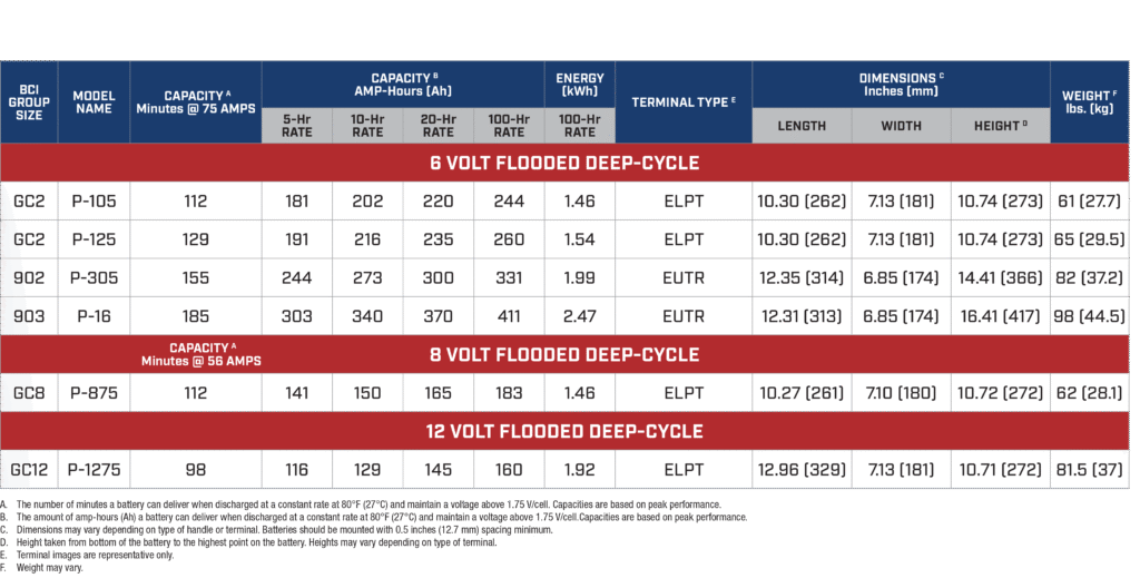 Pacer Battery Company has a robust product portfolio of 6V, 8V, and 12V flooded lead acid batteries made in the USA, of U.S. and imported parts. Pacer batteries are designed to meet target rating specifications to ensure the reliable performance required for your deep cycle needs. Our high quality products are ideal for golf cars and LSEVs, floor care machines, material handling equipment, and aerial work platforms.